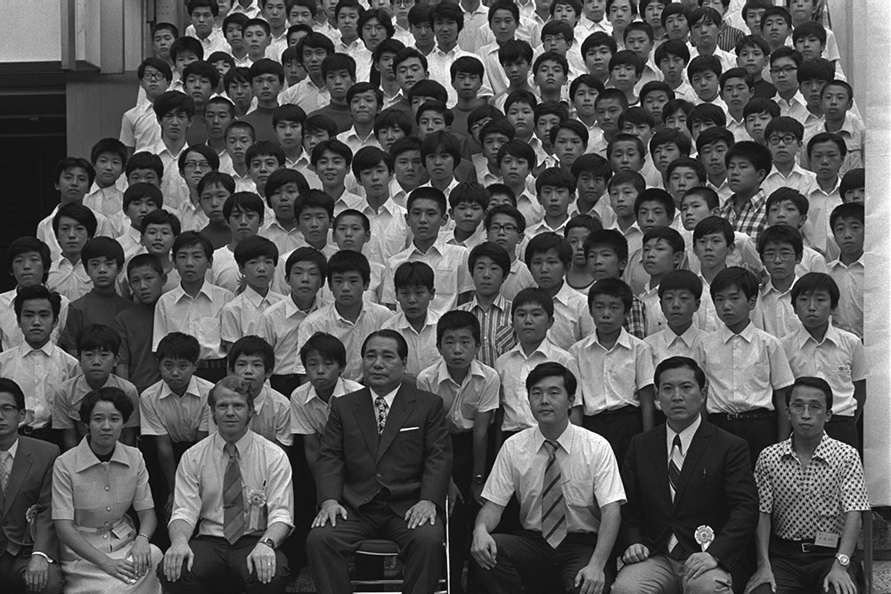 先生の励ましは続きます。同年11月には、「中学生文化新聞」(当時)主催の第1回「作文コンクール」の表彰式に、“未来の文豪たち”へ限りないエールと励ましの言葉が。75年(同50年)9月には、第1回「英語弁論大会」が行われ、終了後に駆け付けた池田先生が参加者全員との記念撮影会を行う場面も――名実ともに師匠の“手作り”によって中等部は発展していきました。